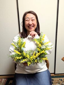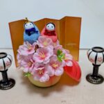 🍑桃の器に梅の花、ちょこんと座った仲良し二人